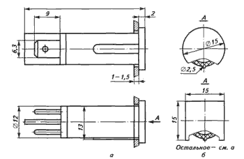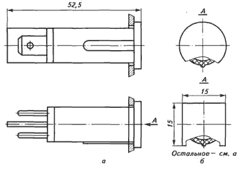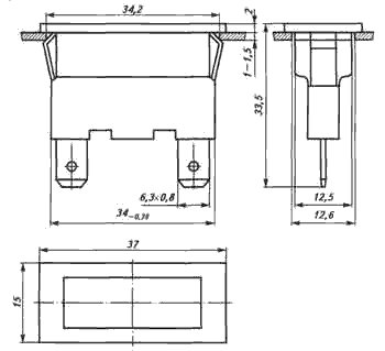 ![]() Рис. 1. Общий вид, габаритные, установочные и присоединительные размеры арматуры с предельной температурой 55 °С с прямоугольным светофильтром | Арматура с предельной температурой 55 °С с прямоугольным светофильтром (рис. 1) состоит из пластмассового корпуса, в котором устанавливается индикатор тлеющего разряда, последовательно соединенный с резистором. Индикатор и резистор до установки в корпус припаиваются к стойкам, представляющим собой вилочную часть стандартизованного плоского втычного соединителя. После установки в корпус соединенных между собой пайкой резистора, индикатора и стоек последние путем разворота с наружной части корпуса жестко фиксируются. Светофильтр прямоугольной формы крепится в корпусе за счет упругих свойств материала с помощью специальных защелок. |