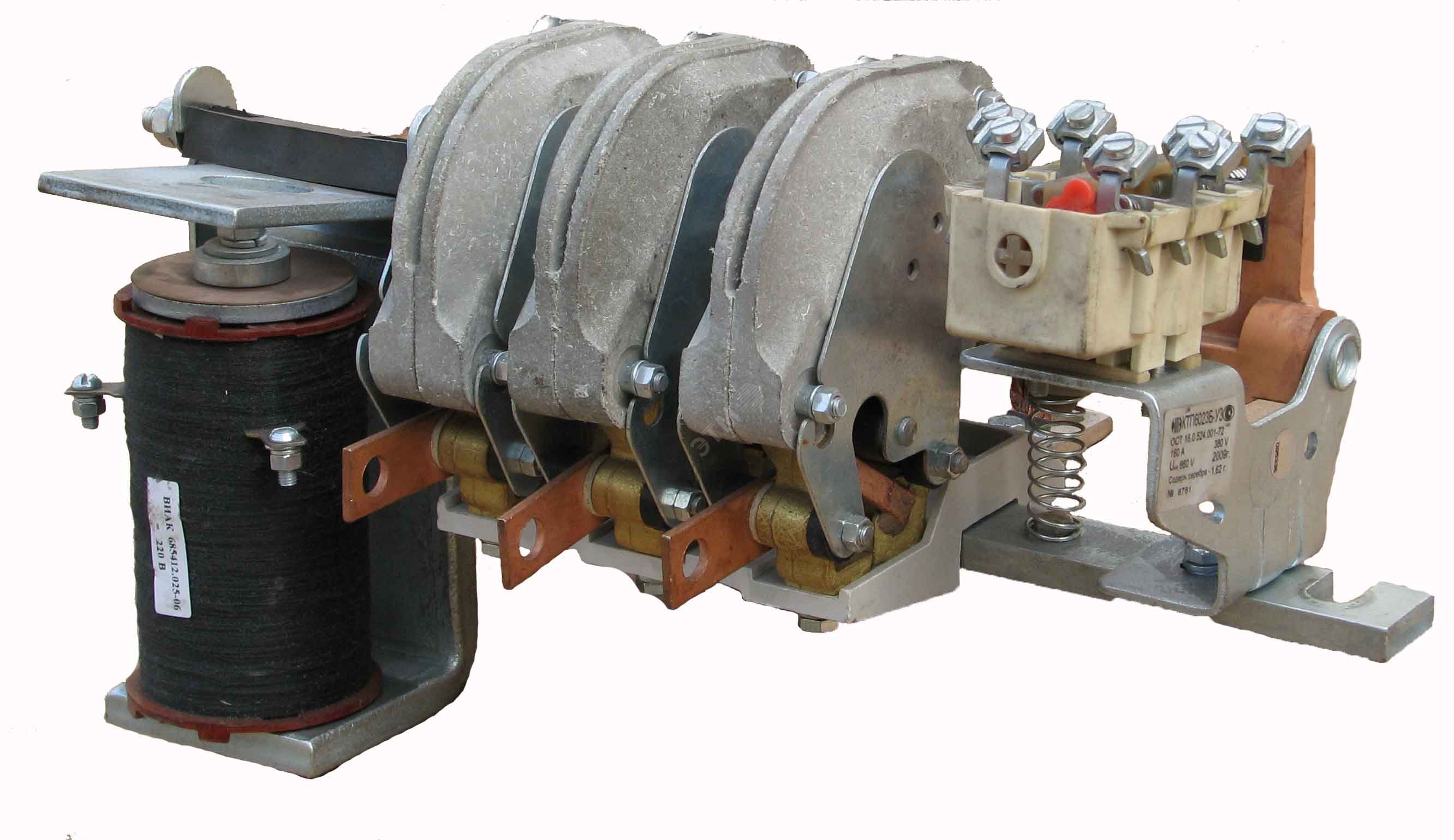 Контактор трехфазный, имеет три силовых контакта для пропускания тока и коммутации приемников электрической энергии. Предназначен для работы под нагрузкой, т.е. при протекании токов по силовой цепи не превышающих номинальных значений, для контактора КТП 6023 Iном=160 А. Возникающая электрическая дуга в месте разрыва силовых контактов эффективно гасится с помощью дугогасительных камер. Управление контактором осуществляется постоянным током 220 В. Блок-контакты собраны по схеме: 2з+2р.