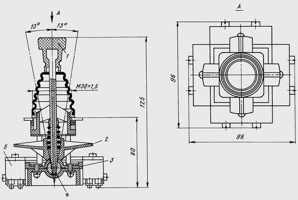 На рис. 1 приведен переключатель, состоящий из приводной рукоятки, сочлененной подвижно с управляющей крестовиной; корпуса, содержащего сферический подпятник, служащий опорой для приводной рукоятки, и микровыключателей.