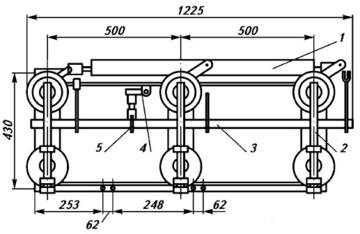 Обозначения: 1 - продольная тяга; 2 - рама; 3 - вал заземления; 4 - рычаг с валом; 5 - регулируемая тяга;