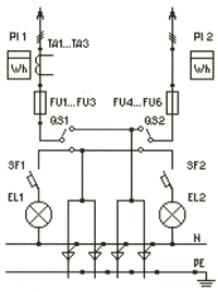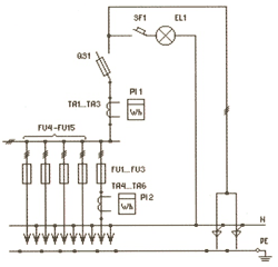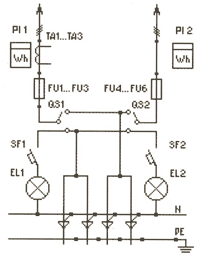 | ВРУ1-14-20УХЛ4 | 2*400 | FU1-FU6: Предохранители ПН2-400 PI1: Счетчик (учет общ. нагр.) PI2: Счетчик (учет домоупр. нагр.) QS1, QS2: Переключатели 400А SF1, SF2: Автоматические выключатели EL1, EL2: Лампы накаливания TA1-TA3: Трансф-ры тока 200/5...400/5 | |