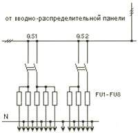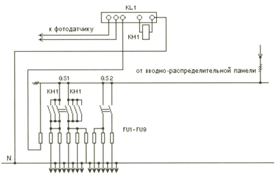 Рис. 3 QS1-QS3: Разъединители QF1-QF16: Автоматические выключатели KM1:Пускатель ПМЛ KV1: Промежуточное реле KL1: Фотореле ФР KT1: Реле времени 2РВМ |